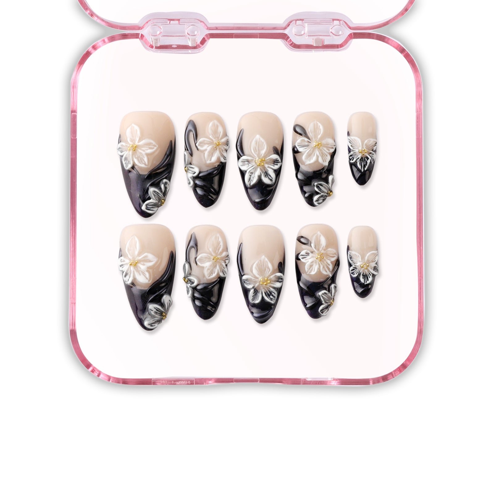 Embrace contrast with Ivory Noir — a sculpted black and white floral press-on nail set. Timeless elegance meets modern artistry in every handmade detail.