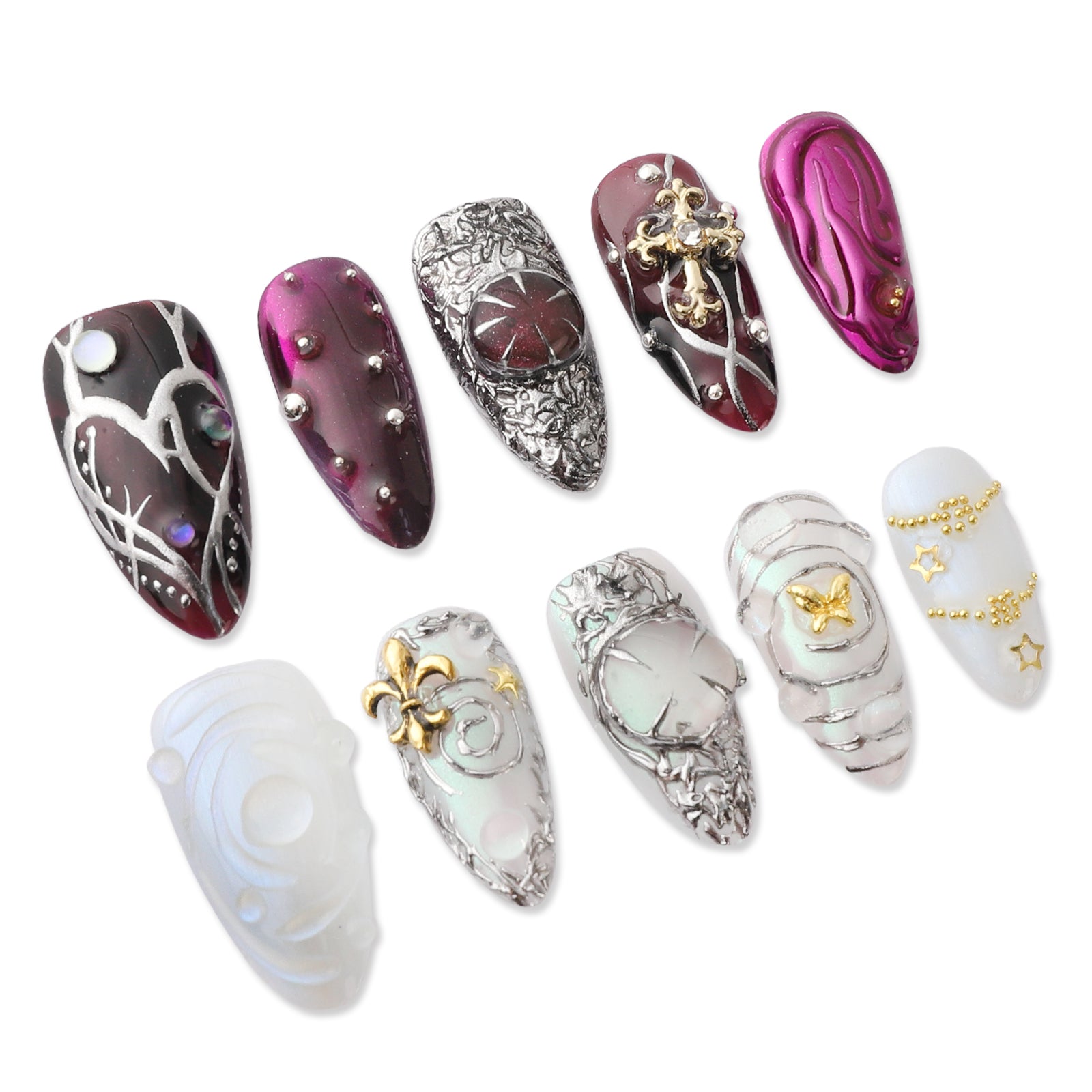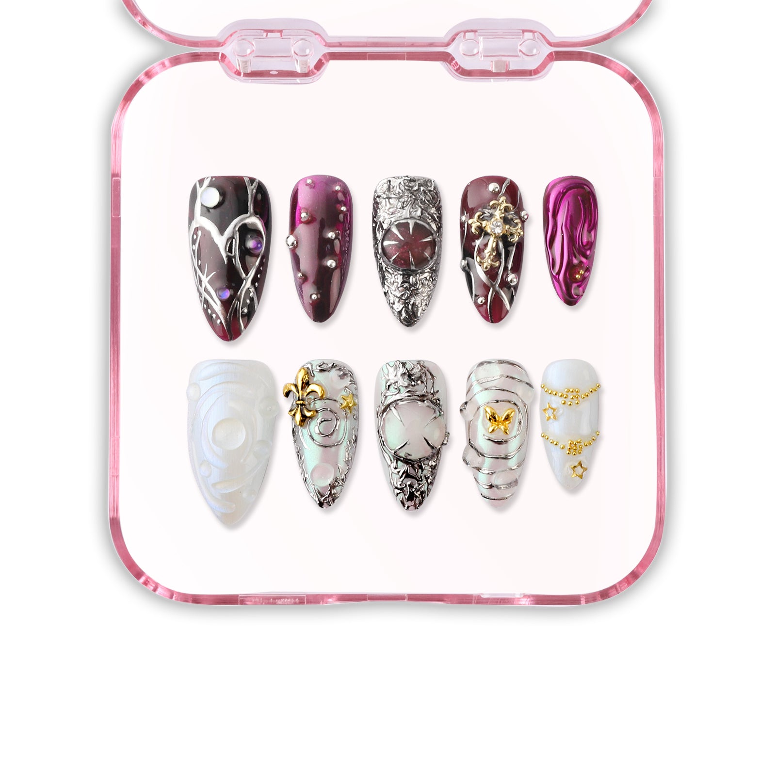 Rule the night with Lunar Monarch — deep violet and silver chrome press-on nails inspired by moonlight and royal elegance. Hand-layered for lasting shine.