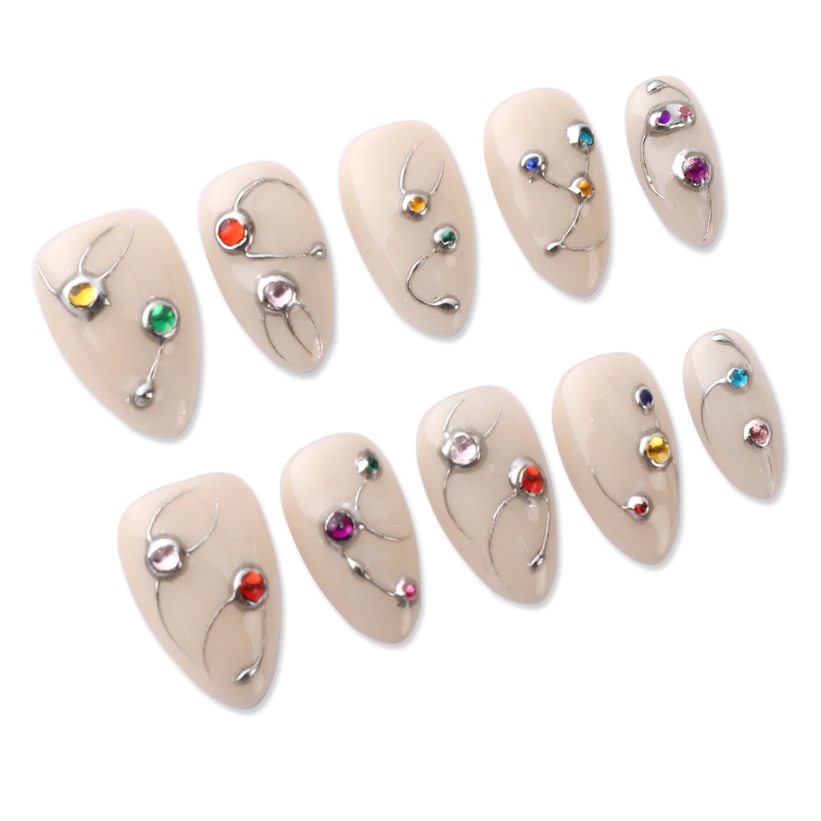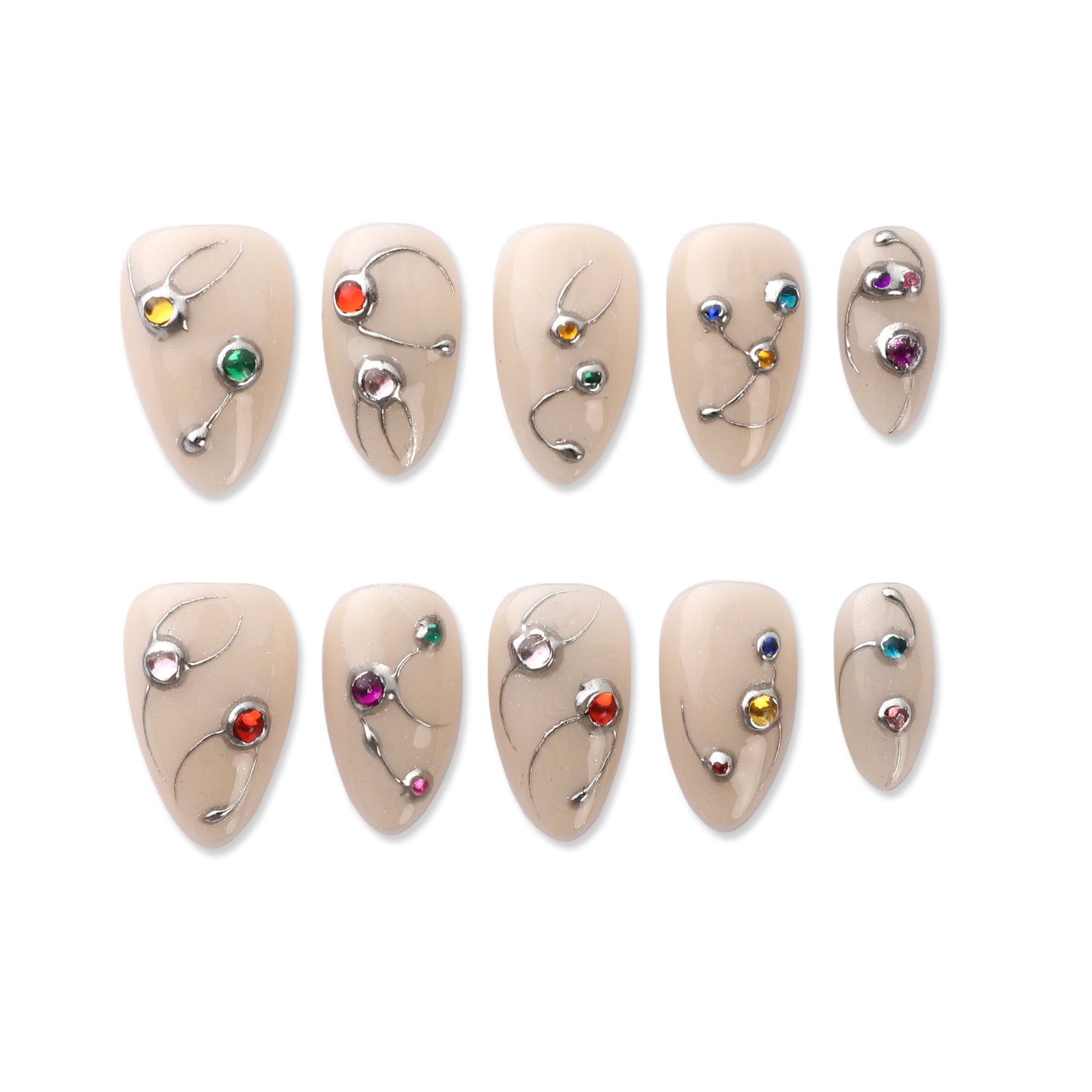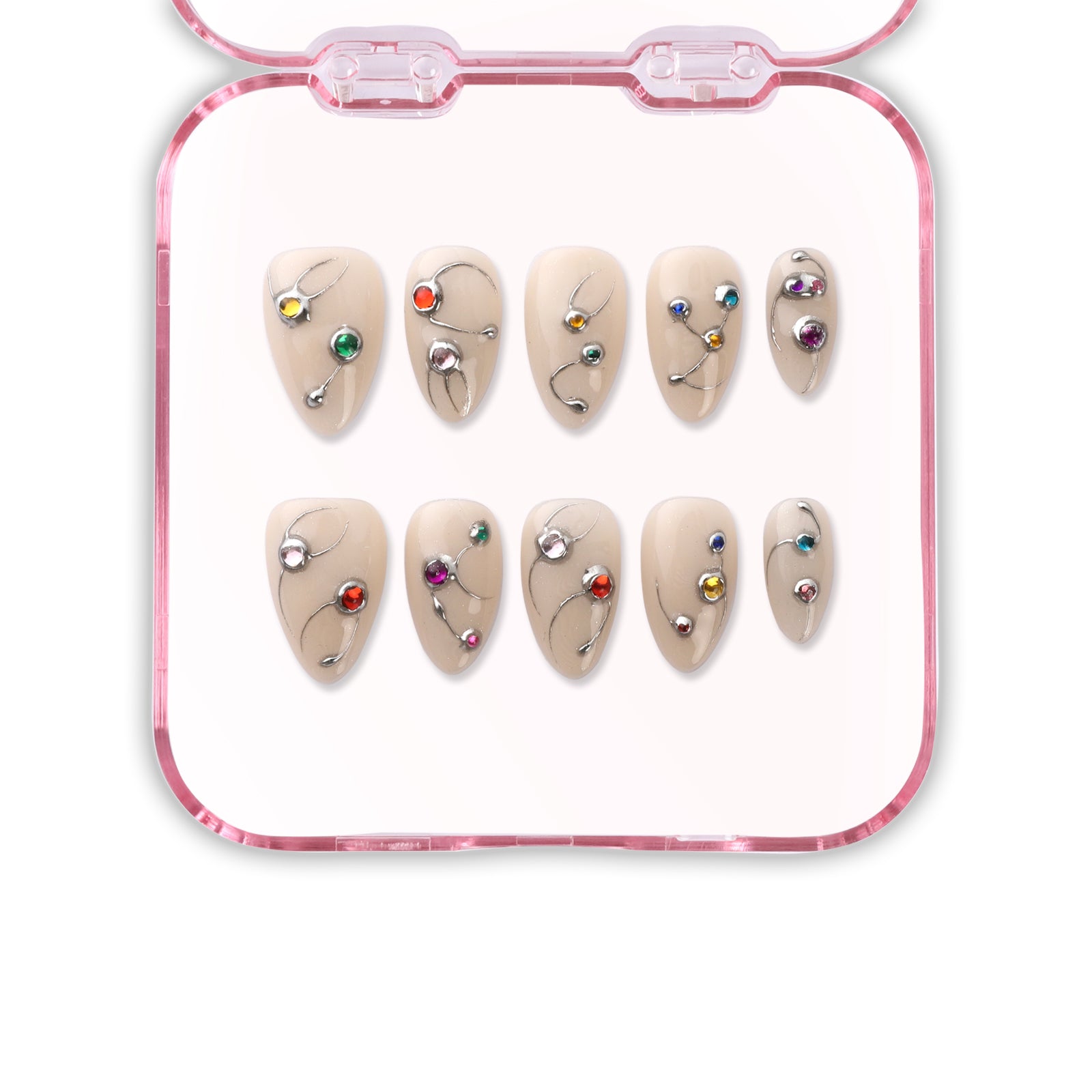 Meet Opal Wire — a minimalist press-on nail set featuring chrome wiring and crystal gems. Sleek, futuristic, and hand-layered for a refined glow.