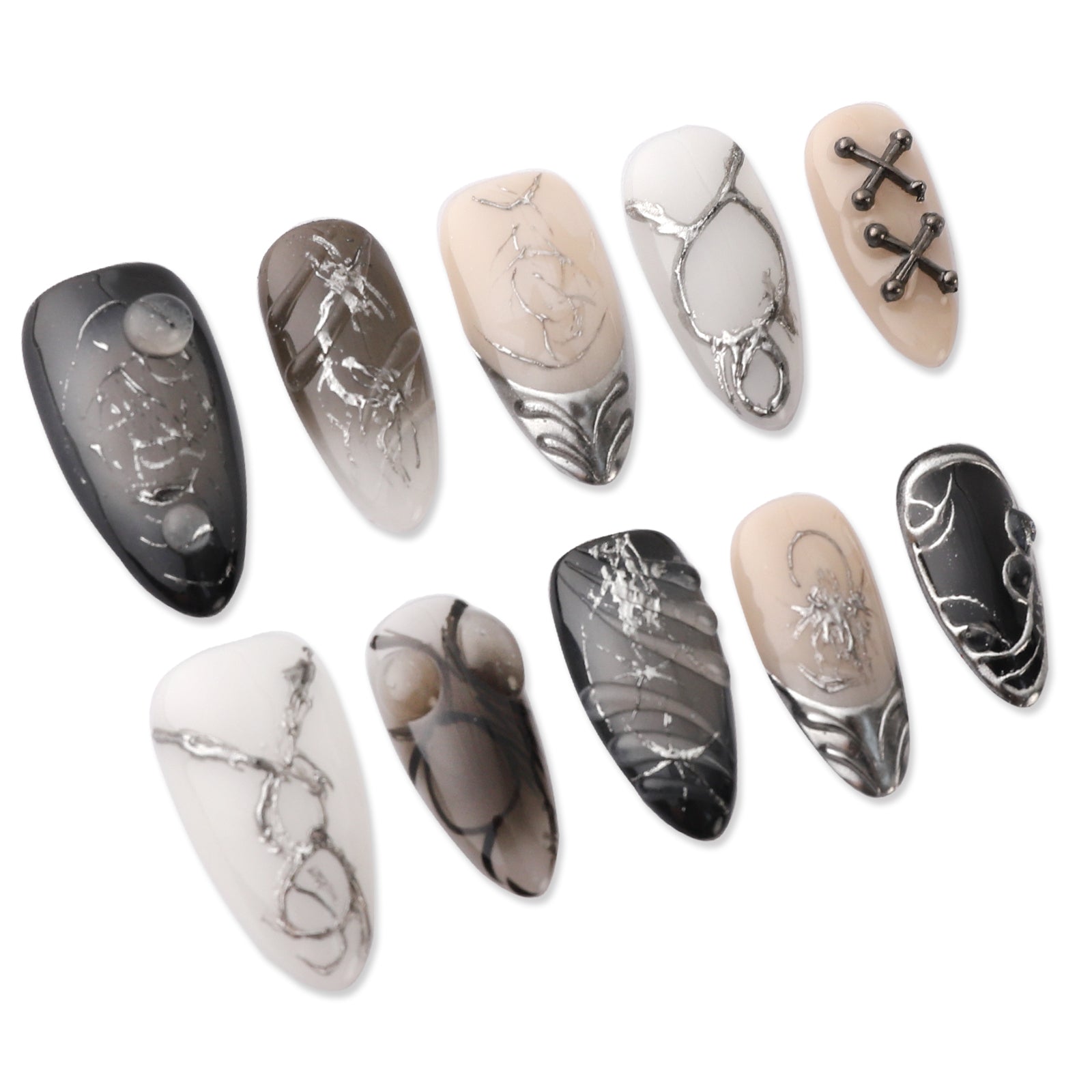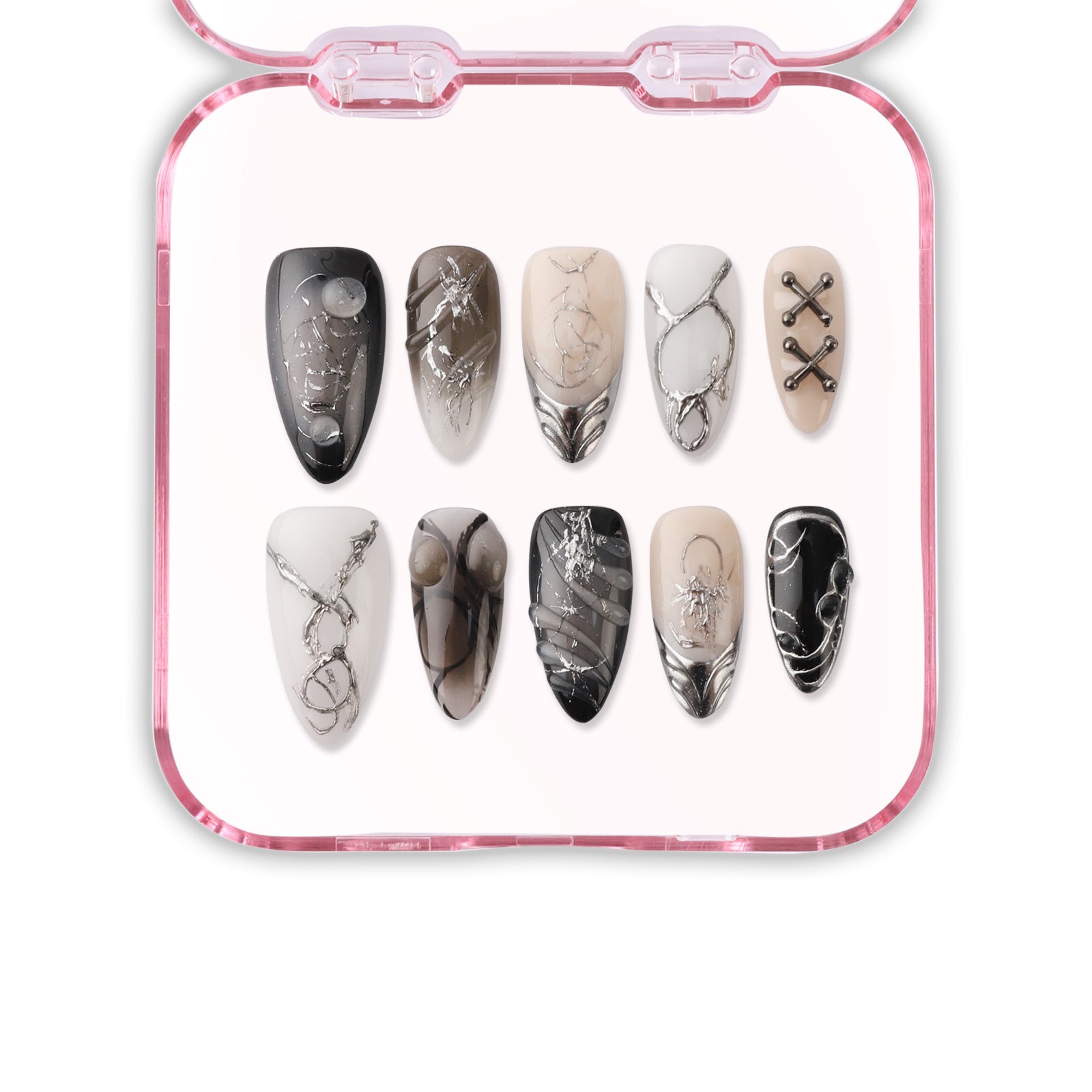 Unleash your edge with Shadow Circuit — matte black and silver metallic press-on nails inspired by futuristic design and bold street style.